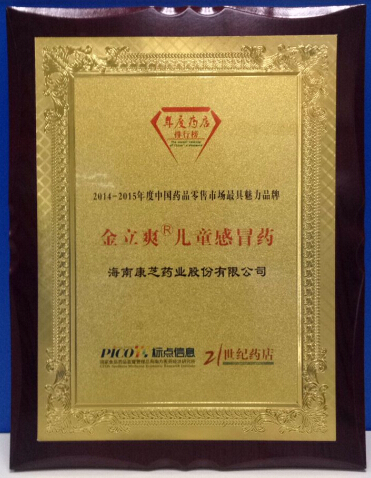 會(huì)議首先公布了2014年度中國(guó)制藥工業(yè)百?gòu)?qiáng)榜、中國(guó)連鎖藥店綜合實(shí)力百?gòu)?qiáng)和中國(guó)連鎖藥店直營(yíng)力百?gòu)?qiáng)榜并進(jìn)行了頒獎(jiǎng),康芝藥業(yè)金立爽榮膺“2014-2015年度中國(guó)藥品零售市場(chǎng)最具魅力品牌”,充分展示了康芝藥業(yè)專注兒童大健康產(chǎn)業(yè)的品牌魅力以及擁有多個(gè)核心產(chǎn)品的市場(chǎng)競(jìng)爭(zhēng)力。康芝藥業(yè)金立爽是第三代兒童感冒藥,作為國(guó)家質(zhì)量標(biāo)準(zhǔn)起草單位,一直以最高質(zhì)量標(biāo)準(zhǔn)引領(lǐng)抗病毒兒童感冒藥的品質(zhì)。此次“2014-2015年度中國(guó)藥品零售市場(chǎng)最具魅力品牌”的殊榮是對(duì)康芝藥業(yè)金立爽的肯定,彰顯了“金立爽氨金黃敏顆粒”作為最受歡迎兒童抗病毒藥物的品牌魅力。