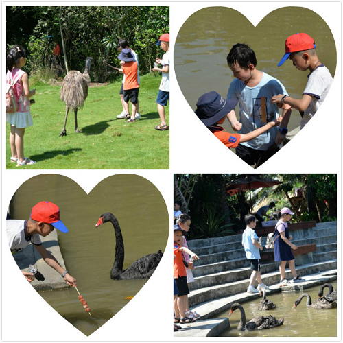 午餐后,大家集體前往南沙水鳥世界。在了解水鳥的形態(tài)與生活之余,孩子們還在專人指導(dǎo)下與各色各樣的水鳥展開了親密“交流”。孩子們或手持草料近距離喂食與他們一般高的鴕鳥;或停下匆忙的腳步,閉著眼聆聽湖畔天鵝的鳴叫;抑或伸出手、探出頭,用觸覺和嗅覺代替眼睛來感知面前的小孔雀。