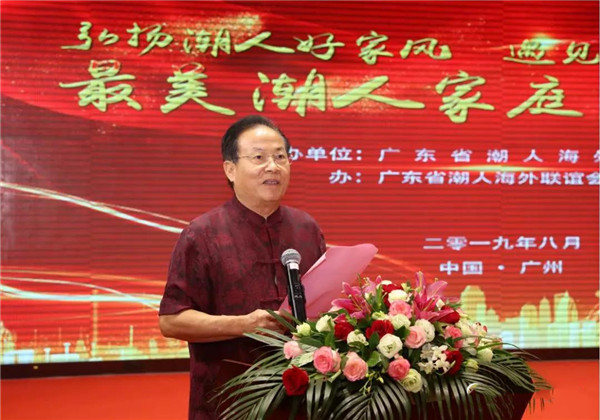 蔡東士會長在表彰大會上致辭。首先,他對獲獎(jiǎng)家庭表示熱烈祝賀。他說,我們隆重舉行廣東省潮人海外聯(lián)誼會“十大最美潮人家庭”和“最美潮人家庭”表彰大會,這是貫徹落實(shí)習(xí)近平總書記關(guān)于重視家庭家風(fēng)建設(shè)有關(guān)論述的重要舉措。省潮聯(lián)自成立以來一直十分重視宣傳中華優(yōu)秀傳統(tǒng)文化,弘揚(yáng)潮汕地區(qū)優(yōu)良家風(fēng)。今年是新中國成立七十周年,70年來所取得的輝煌成就令人鼓舞,正因?yàn)橛凶鎳姆睒s富強(qiáng),才有我們的幸福生活。我們舉辦這次表彰活動(dòng),就是希望弘揚(yáng)家國情懷,發(fā)揮榜樣的力量,凝心聚力,以一帶十,以十帶千,引導(dǎo)更多潮籍家庭積極踐行社會主義核心價(jià)值觀,傳承中華民族的好家風(fēng),樹立文明家庭榜樣,傳遞“好家庭、好家教、好家風(fēng)”正能量,為實(shí)現(xiàn)中華民族偉大復(fù)興中國夢做出貢獻(xiàn),共同創(chuàng)造更加幸福美好的明天。
