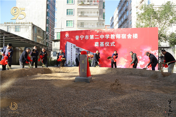 上午8時40分,教師宿舍樓工程奠基儀式開始,參加儀式的主禮嘉賓為奠基石培土壯基。