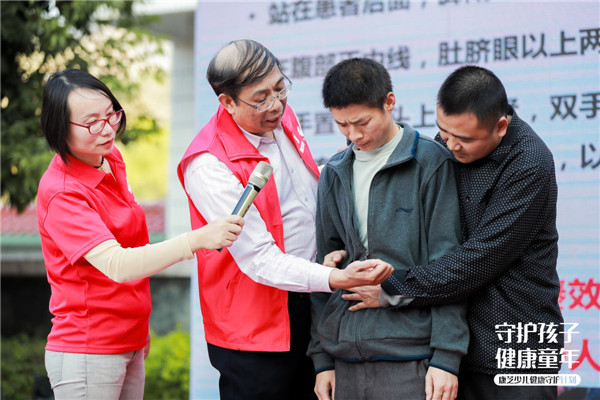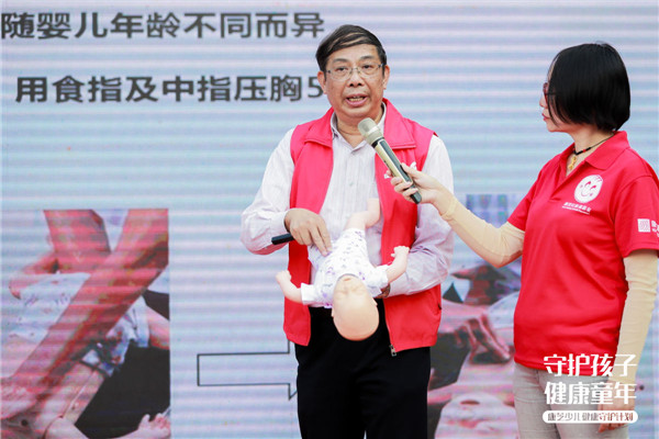 其中,結(jié)合當前兒童常見意外情況,丘教授著重給現(xiàn)場孩子家長講解了如何正確應(yīng)對兒童氣道異物梗阻狀況。為了讓現(xiàn)場聽眾更直觀地了解“海姆立克”急救手法,丘教授使用了仿真嬰兒進行現(xiàn)場教學,此外,還邀請了兩名家長上臺進行真人示范,確保孩子及家長實際掌握到該急救手法。