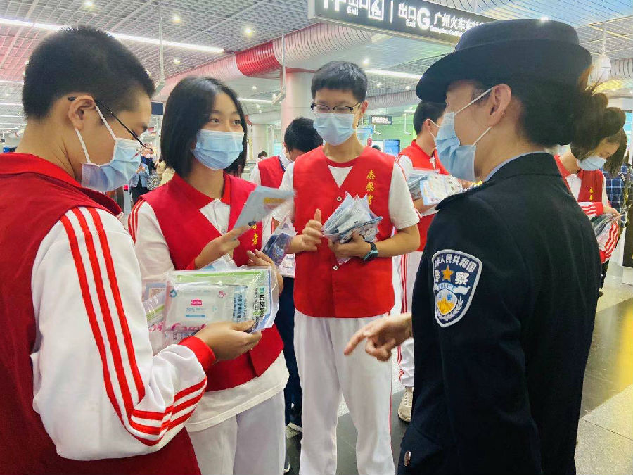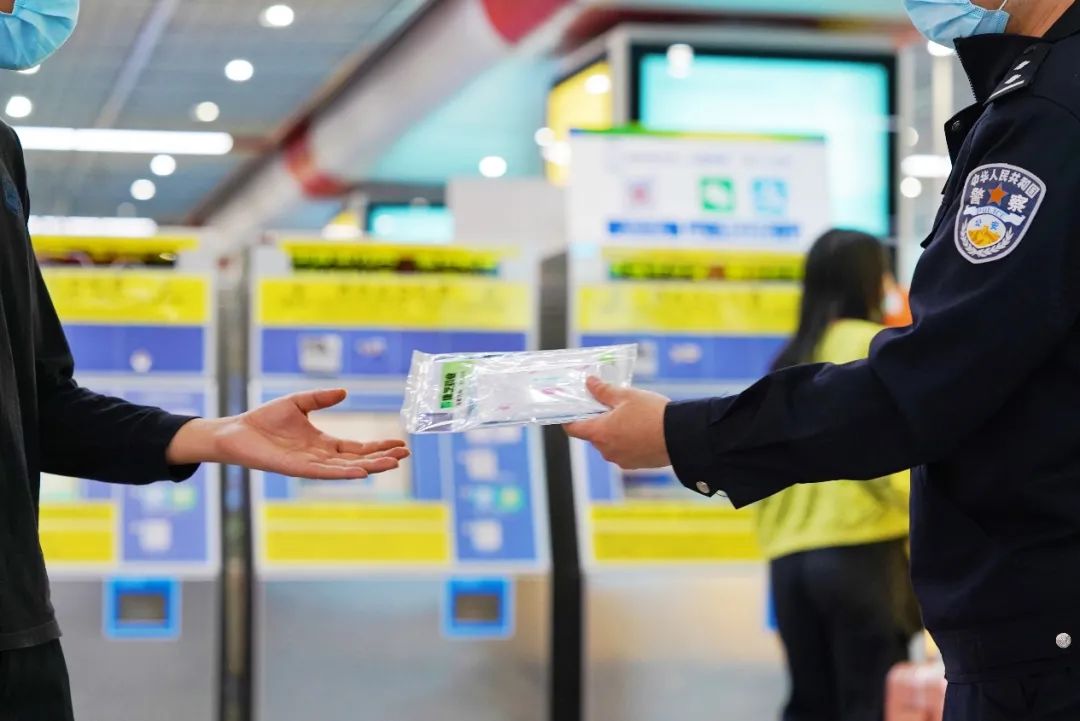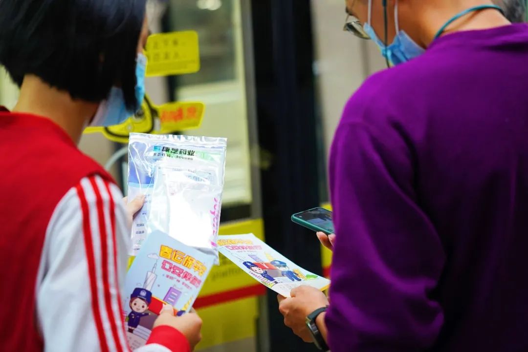 本次志愿服務(wù)活動(dòng)中,來自各個(gè)中學(xué)的20余名學(xué)生志愿者在民警、輔警的帶領(lǐng)下,在進(jìn)站口、售票機(jī)和地鐵站臺(tái)等位置,向來往乘客講解“斷橋詐騙”和“小額票卡詐騙”等針對(duì)旅客等常見騙局,并派發(fā)由康芝藥業(yè)為返鄉(xiāng)旅客貼心準(zhǔn)備的康芝防疫出行暖心包,里面含有成人+兒童醫(yī)用口罩和免洗手消毒凝膠,為春運(yùn)健康出行保駕護(hù)航。